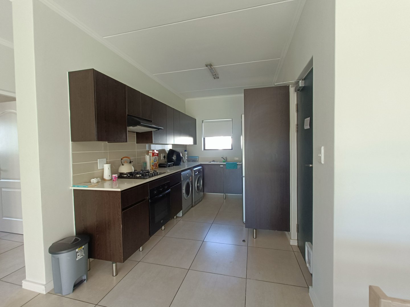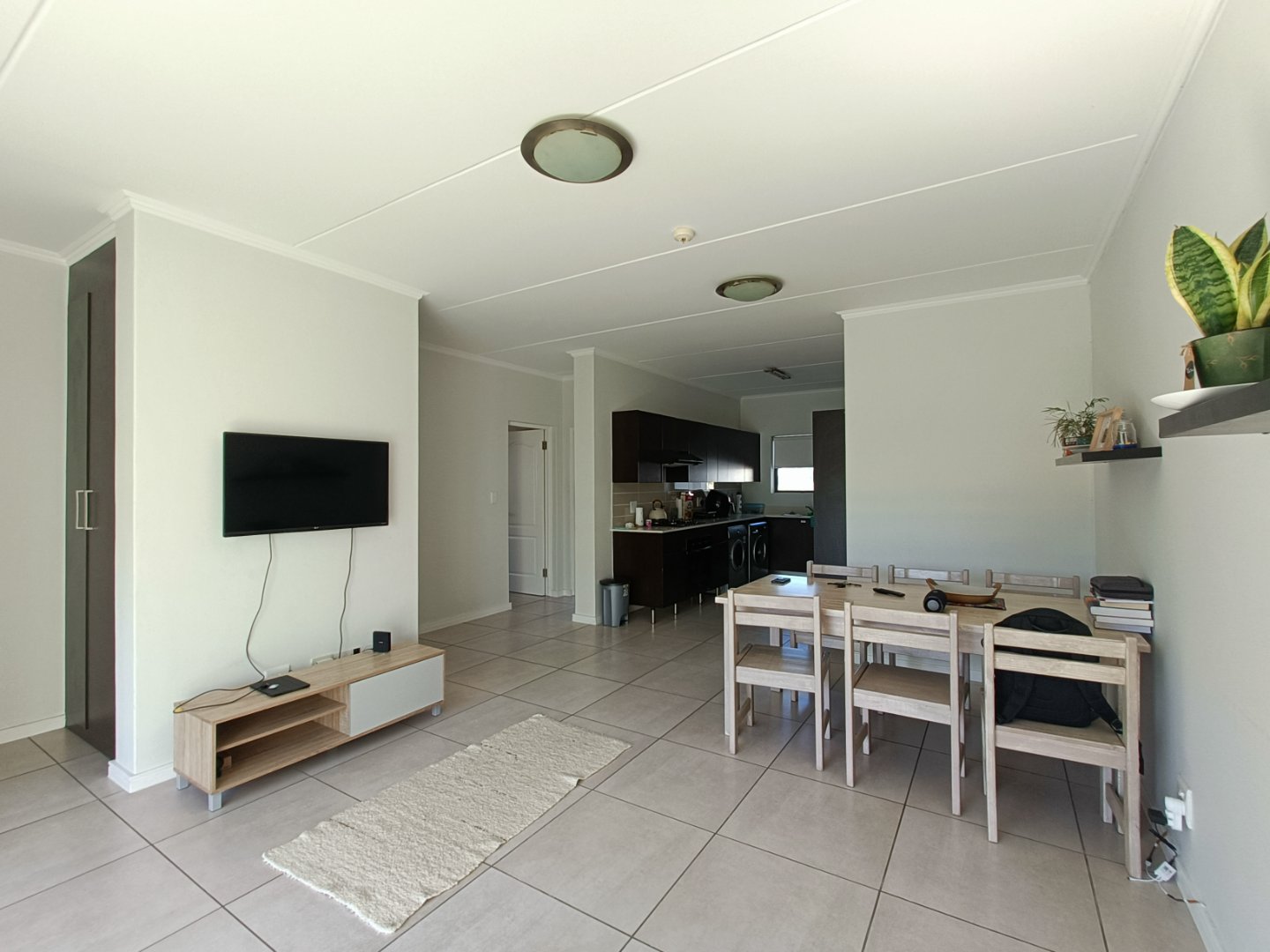 Open plan lounge/dining area/ kitchen. Sliding door from lounge open to balcony. Kitchen with Caesarstone counter tops, built-in cupboards, 4 plate gas stove/ electric oven, fridge/freezer, washing machine, dishwasher and tumble dryer.