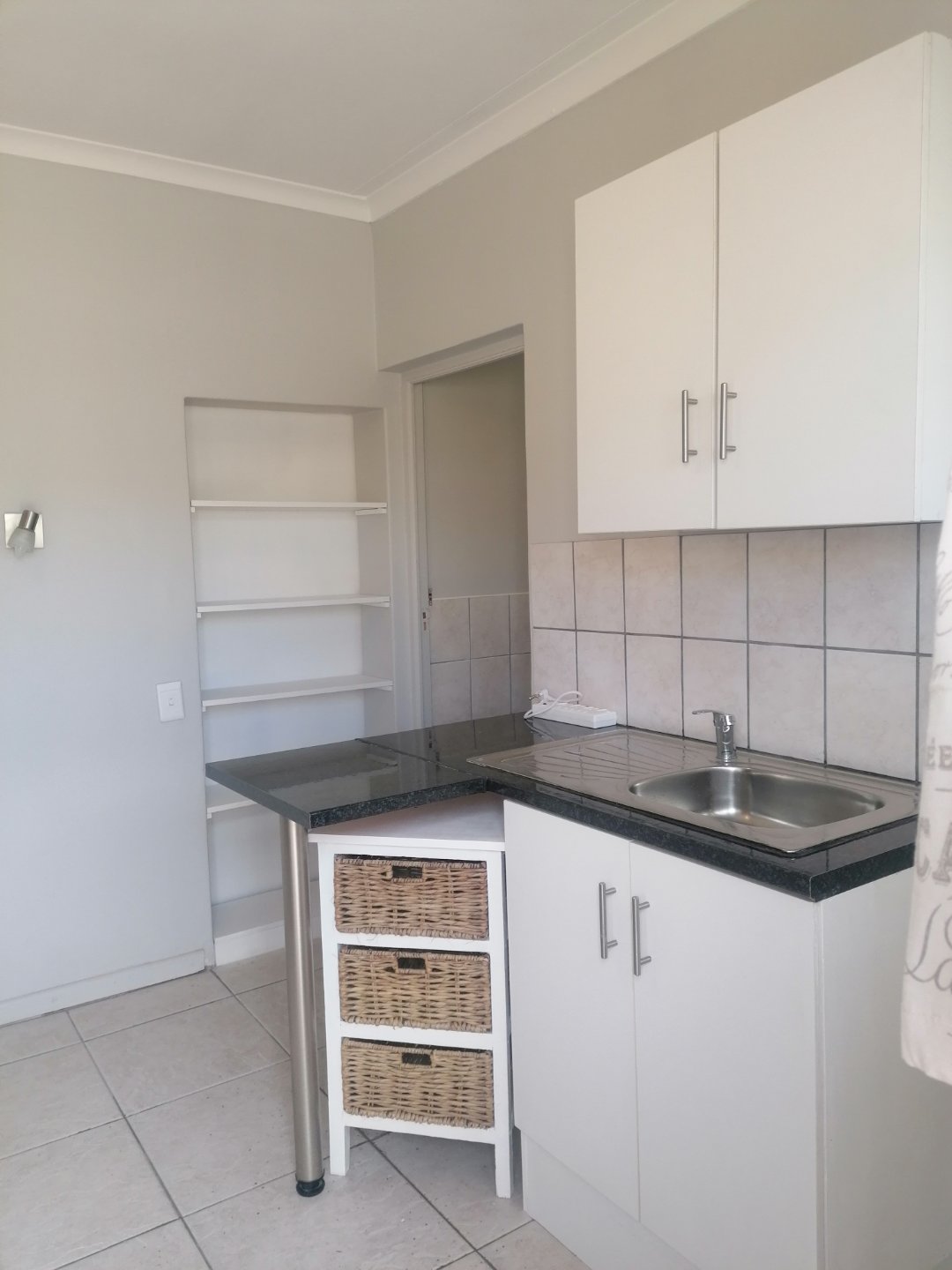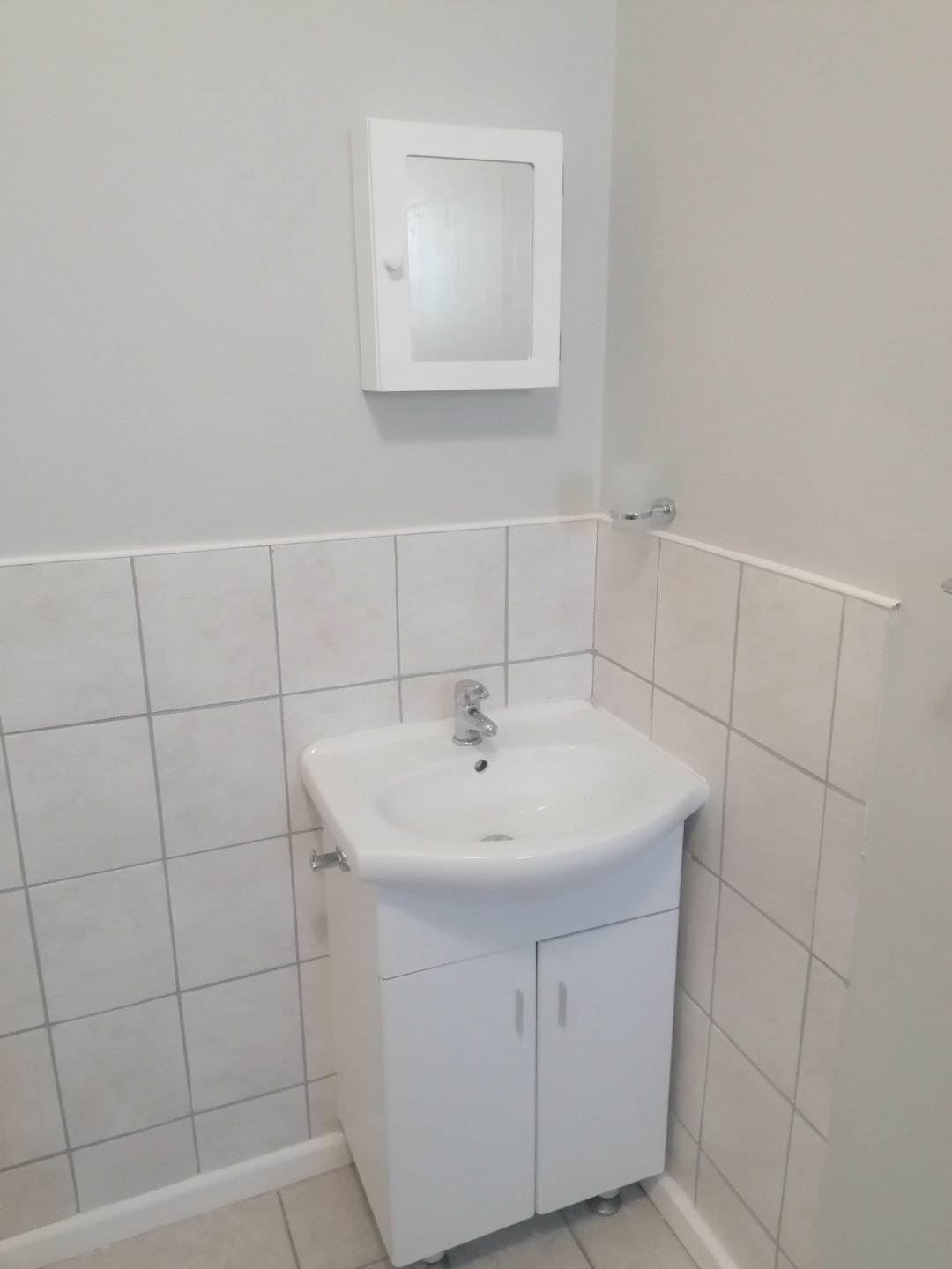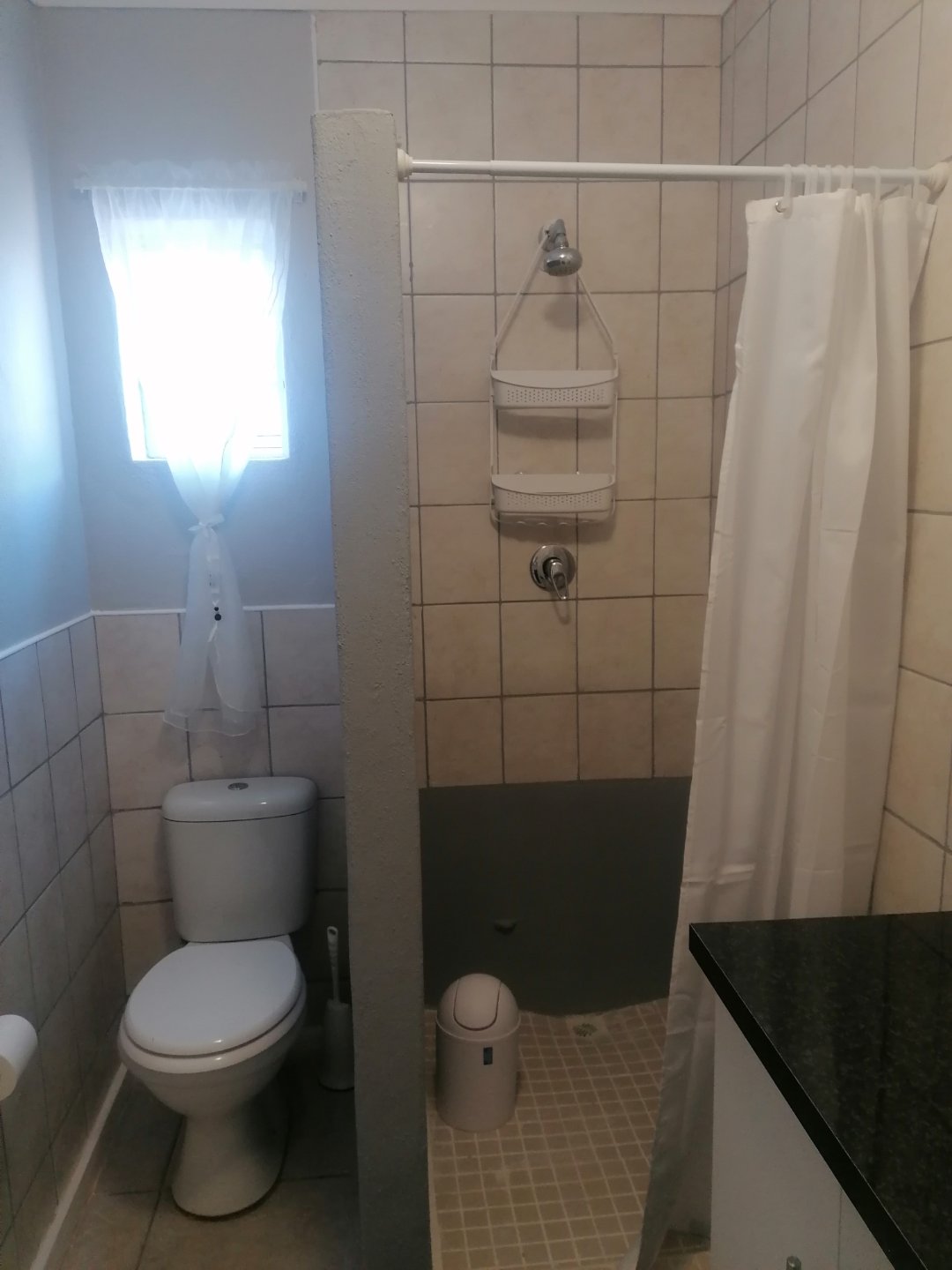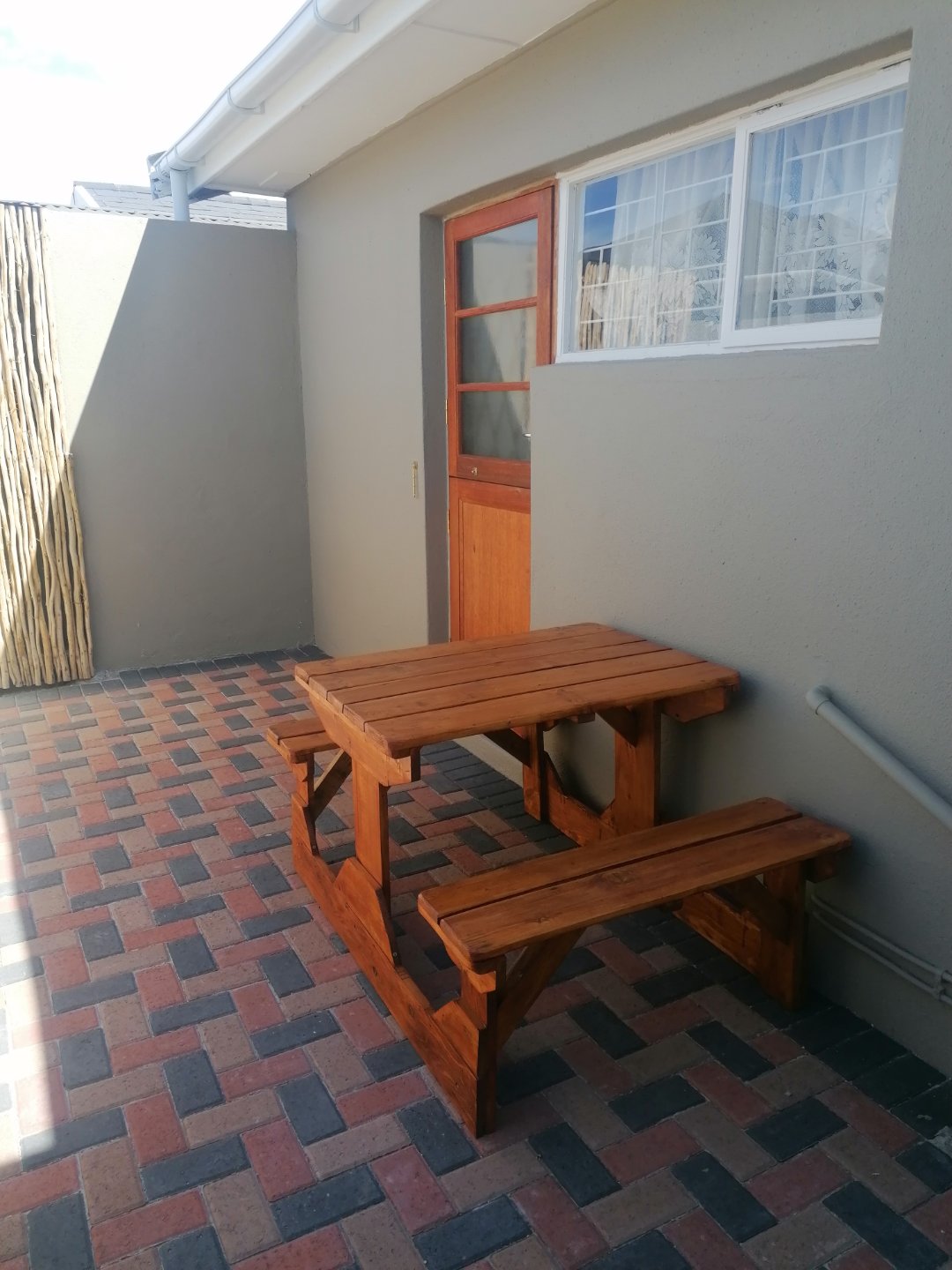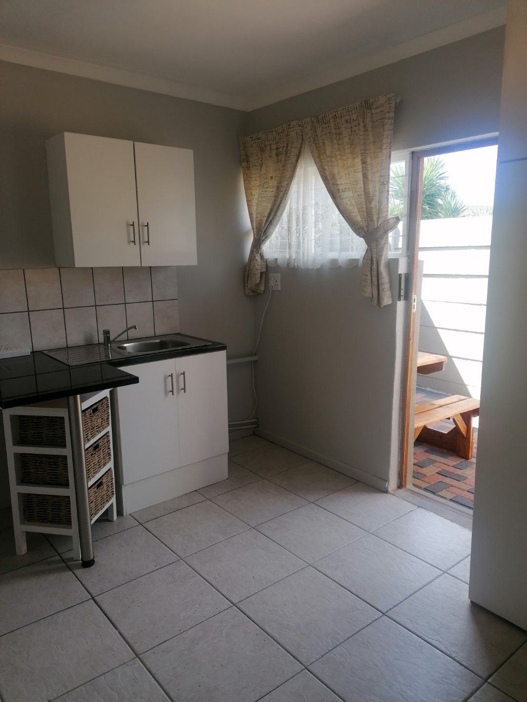 One room with built in cupboards and small kitchenette. Bathroom with shower, basin and toilet. Outside seating area.